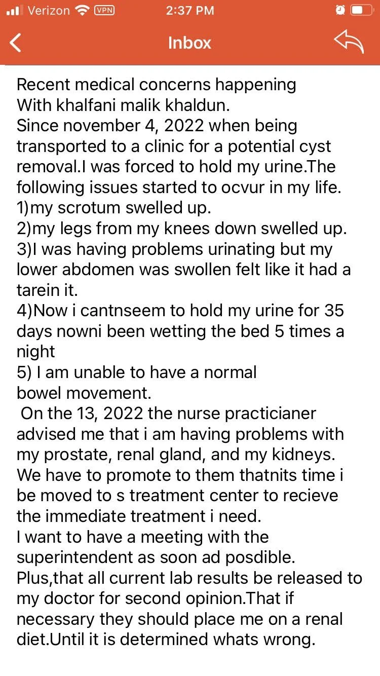 On Nov. 4, Khalfani was transported to a clinic 4 hours away from Westville to have the cyst examined. During the journey, he was not allowed to use the restroom, and began to experience serious abdominal pain as a result of being forced to hold his urine. The same occurred on the way back to Westville, and the result has been that Mr. McQuay has been suffering from extreme abdominal pain, swelling in his genitals, legs, and feet , and has been unable to control his bladder since Nov. 4. He has never experienced these types of issues in his life, and he is concerned that he is experiencing some type of organ failure (possibly liver failure). Despite repeated attempts to get the issues addressed appropriately by Westville CF medical staff, through the proper channels, no serious attempt has been made to address the abdominal/bladder issues adequately, nor has the cyst been removed.