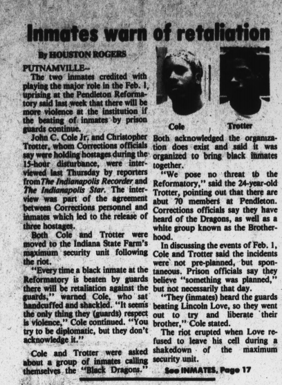Indianapolis newspaper article about the Feb. 1, 1985 Uprising featuring John “Balagoon” Cole and Christopher “Naeem” Trotter.